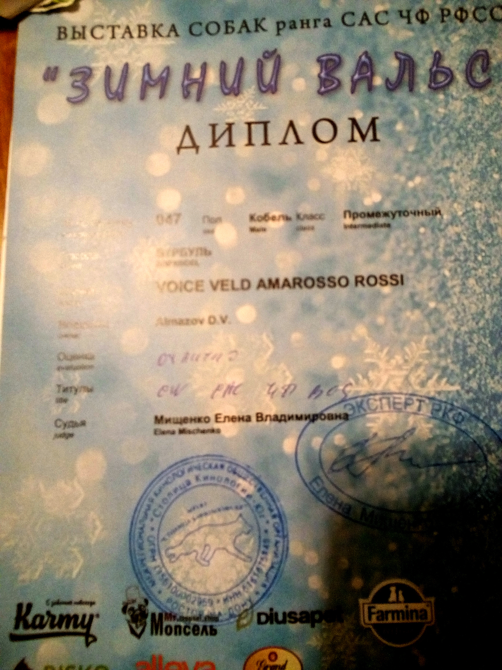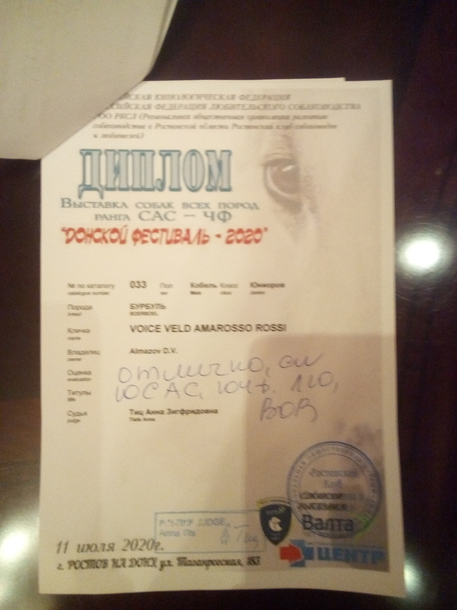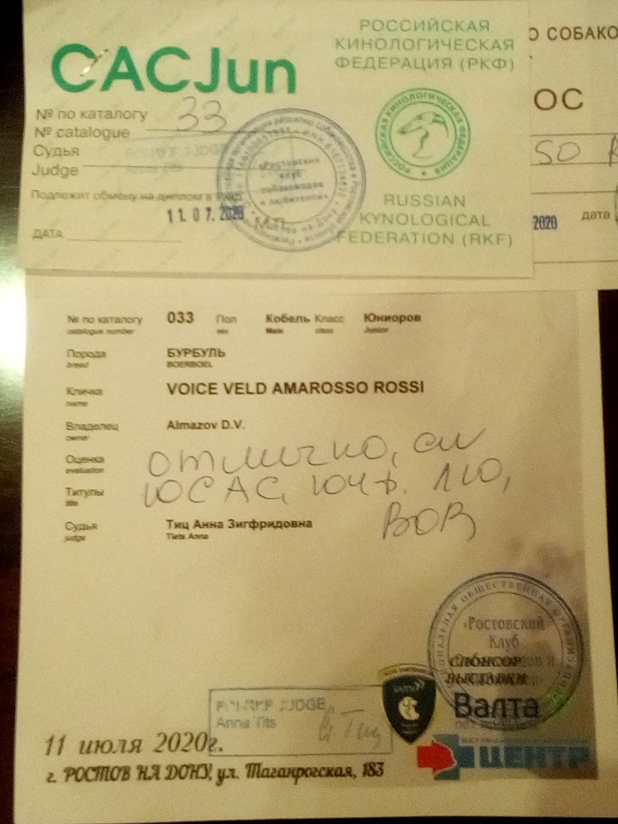 Выставка 11 июля 2020 Донской Фестиваль 2020. Войс Вельд Амароссо Росси. Оценка отлично. Лучший юниор. ЮCAC. LW. Лучший представитель породы.Юный Чемпион России РФСС.