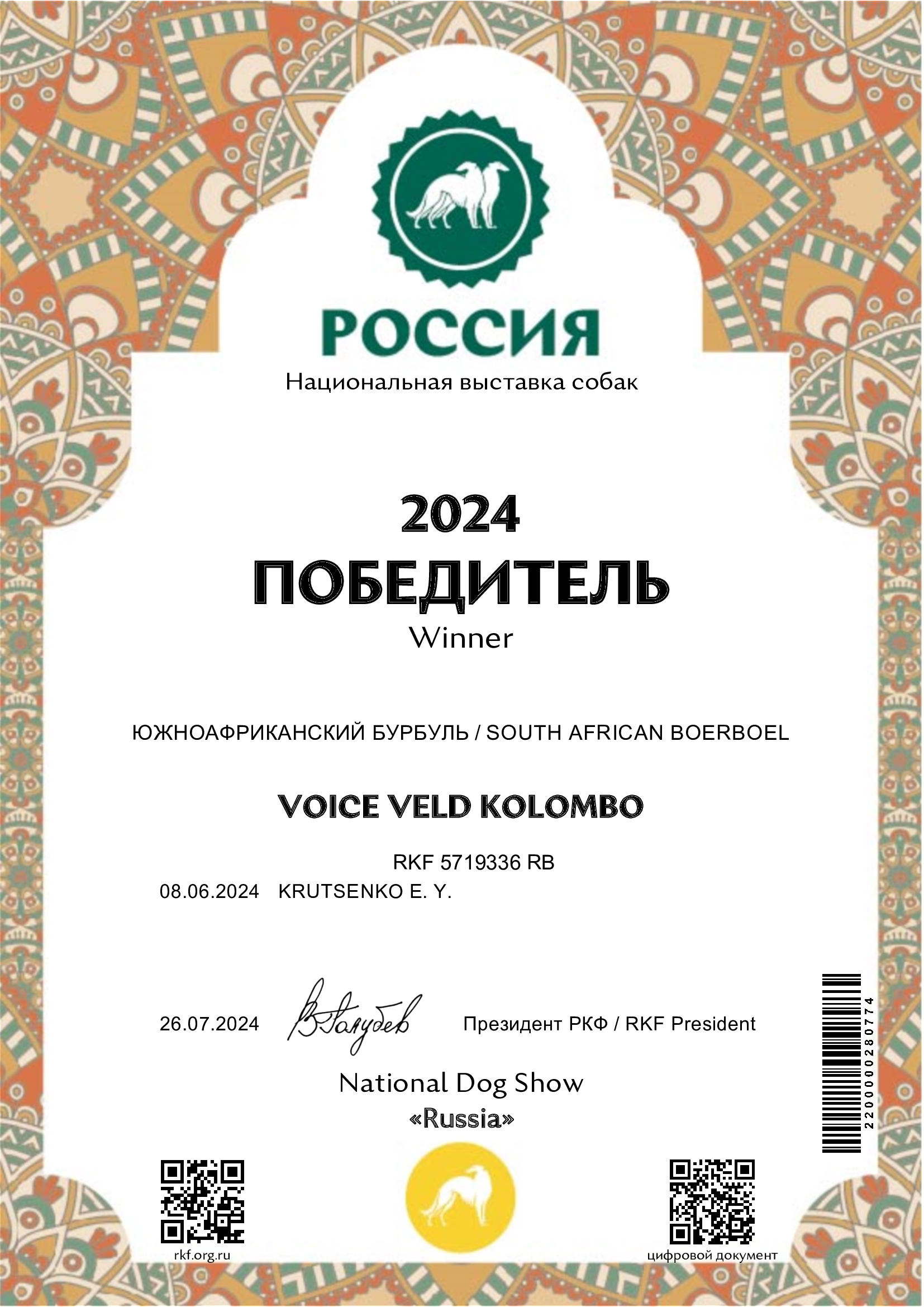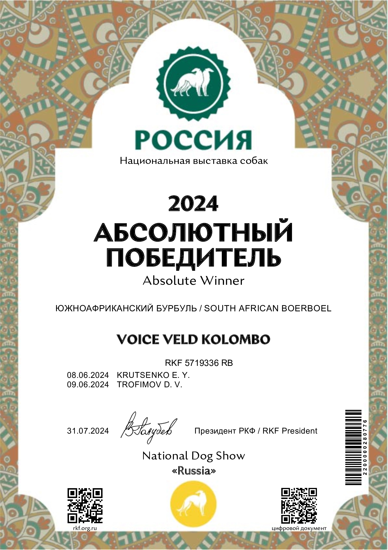 По результатам двух побед в двух выставках завоёван титул "Абсолютный победитель России 2024"